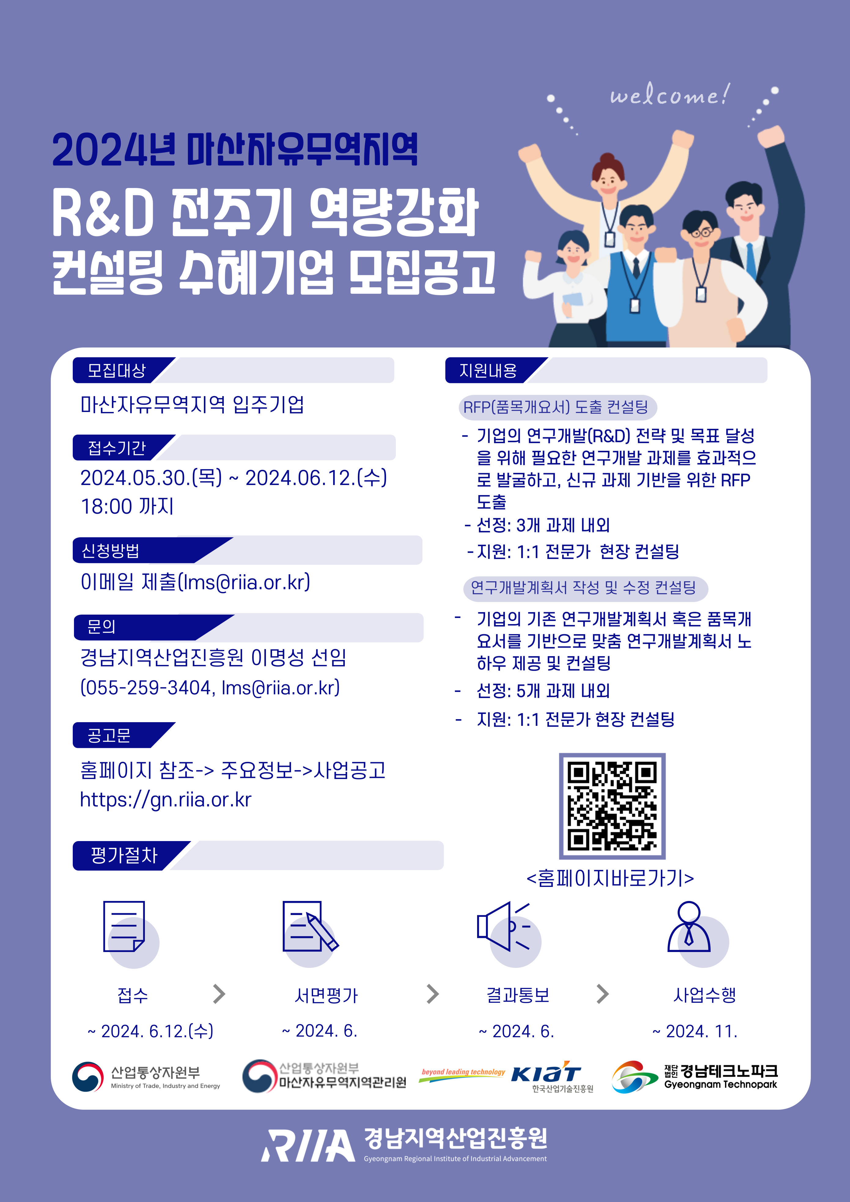 산업통상자원부와 (재)경남지역산업진흥원에서는 「2024년 자유무역지역 역량강화 기업지원사업」의 일환으로 추진 중인 역량강화 기업지원사업을 아래와 같이 모집하오니, 사업에 참여하고자 하는 마산자유무역지역 입주기업은 안내에 따라 신청하시기 바랍니다.