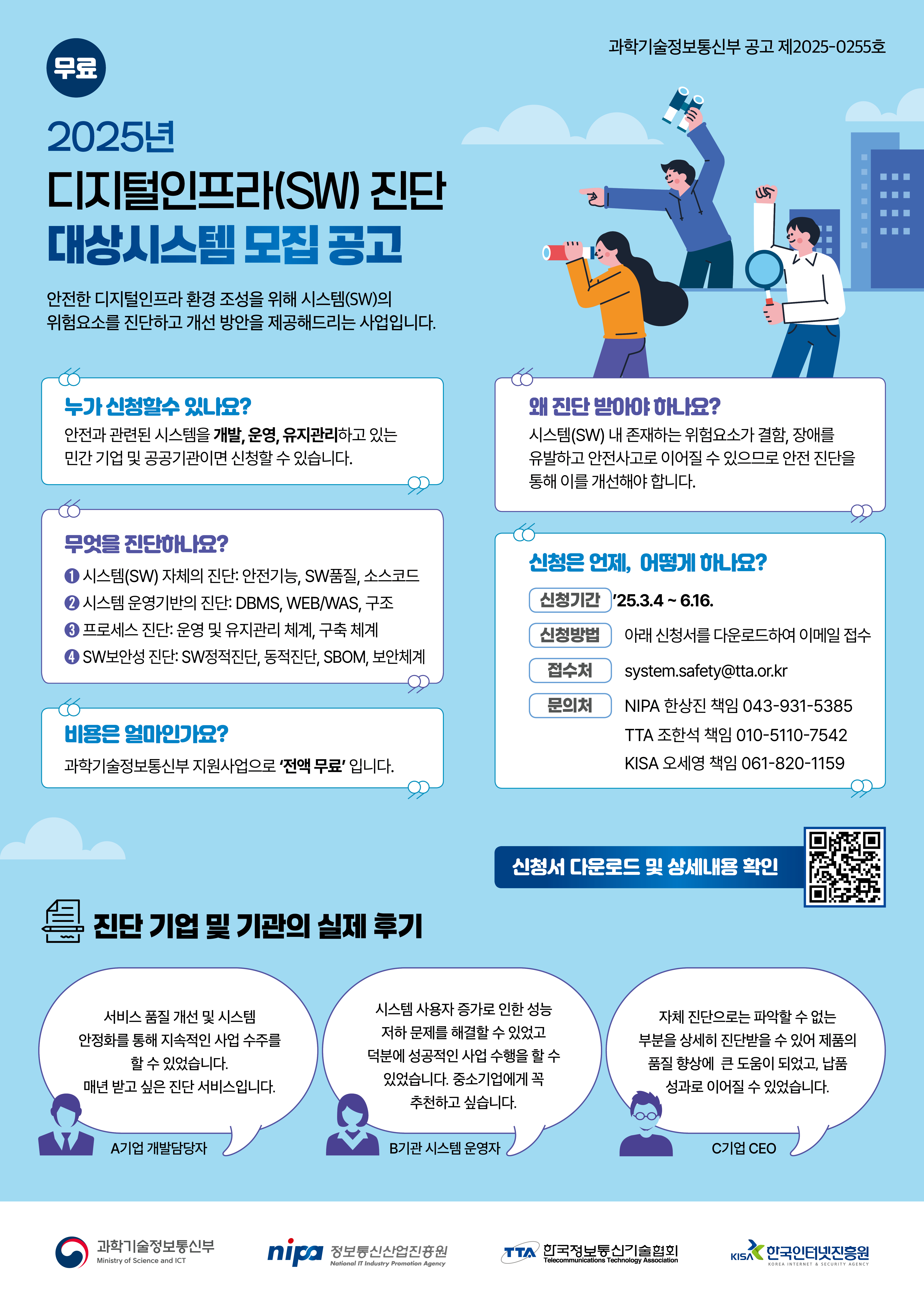 - 과학기술정보통신부 주관사업으로, 민간 및 공공기관의 안전 관련 시스템에 대해 무료로 SW안전 진단 서비스를 제공해드리는 사업입니다.